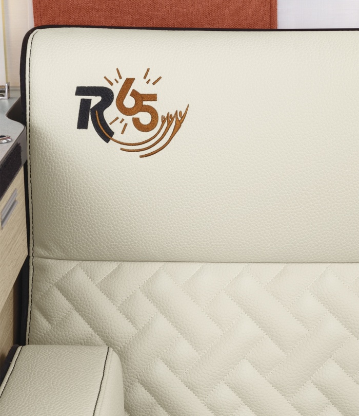 De jubileummodellen hebben een exclusieve geborduurde bekleding 65 jaar (op de stoffen bekleding TEP NOUMEA en PALMA).